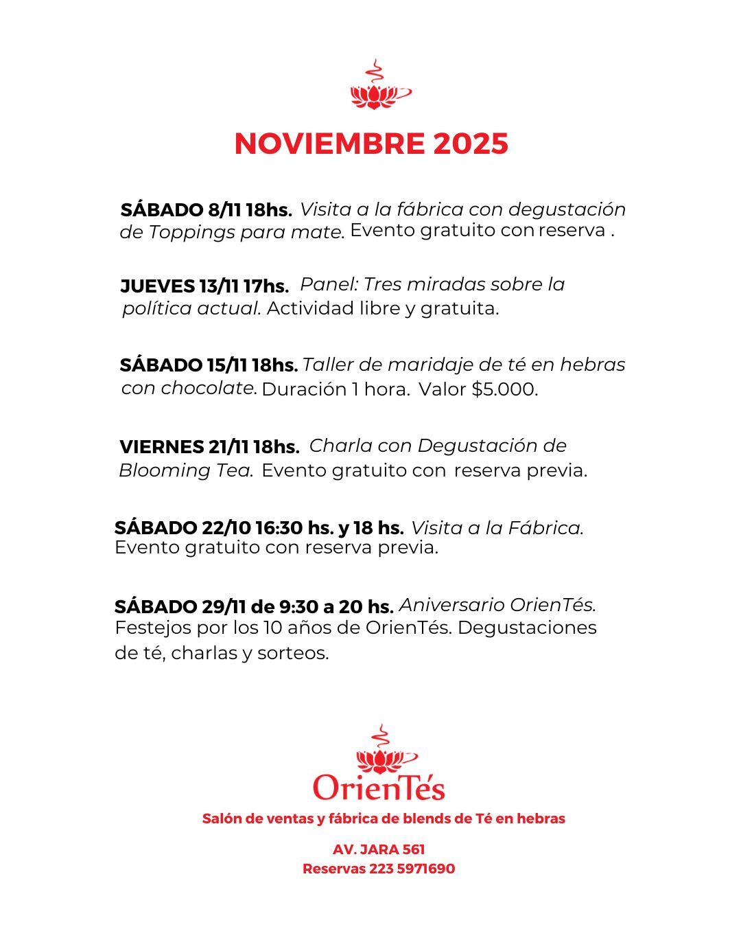 Todos los meses, desde OrienTés ofrecemos la cartelera de eventos de nuestro Salón Cultural.